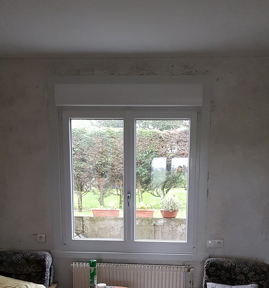 Pose de fenêtres pvc blanc avec volets intégrés. Fenêtres en pvc blanc gamme Kommerling Évolution. Dormant neuf de 100mm avec 5 chambres d'isolation. Vitrage 28mm en 4/20/4 + gaz argon. Quincaillerie de sécurité. Poignées secustic. Volet roulant motorisé filaire. Mini coffre de 186mm isolé thermique et phonique. Lames aluminium......... Pour toute demande, n'hésitez pas à nous contacter!